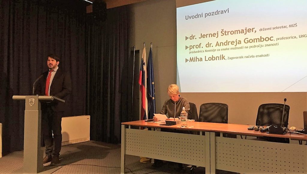 V uvodnem govoru je poudaril, da je spol ena izmed osebnih okoliščin, na podlagi katerih je oseba lahko diskriminirana. Mlade ženske v Evropi v povprečju dosegajo višjo stopnjo izobrazbe kot moški. Delež žensk v akademskih ustanovah narašča, njihovo napredovanje v nazive pa je izjemno počasno. Razvoj in uporaba znanja vseh sta ključnega pomena za napredek družbe, v kateri živimo. »Trenutni delež žensk med raziskovalci in raziskovalkami v Sloveniji znaša 34%, med rednimi profesoricami pa samo 17% žensk,« je izpostavil Zagovornik načela enakosti.